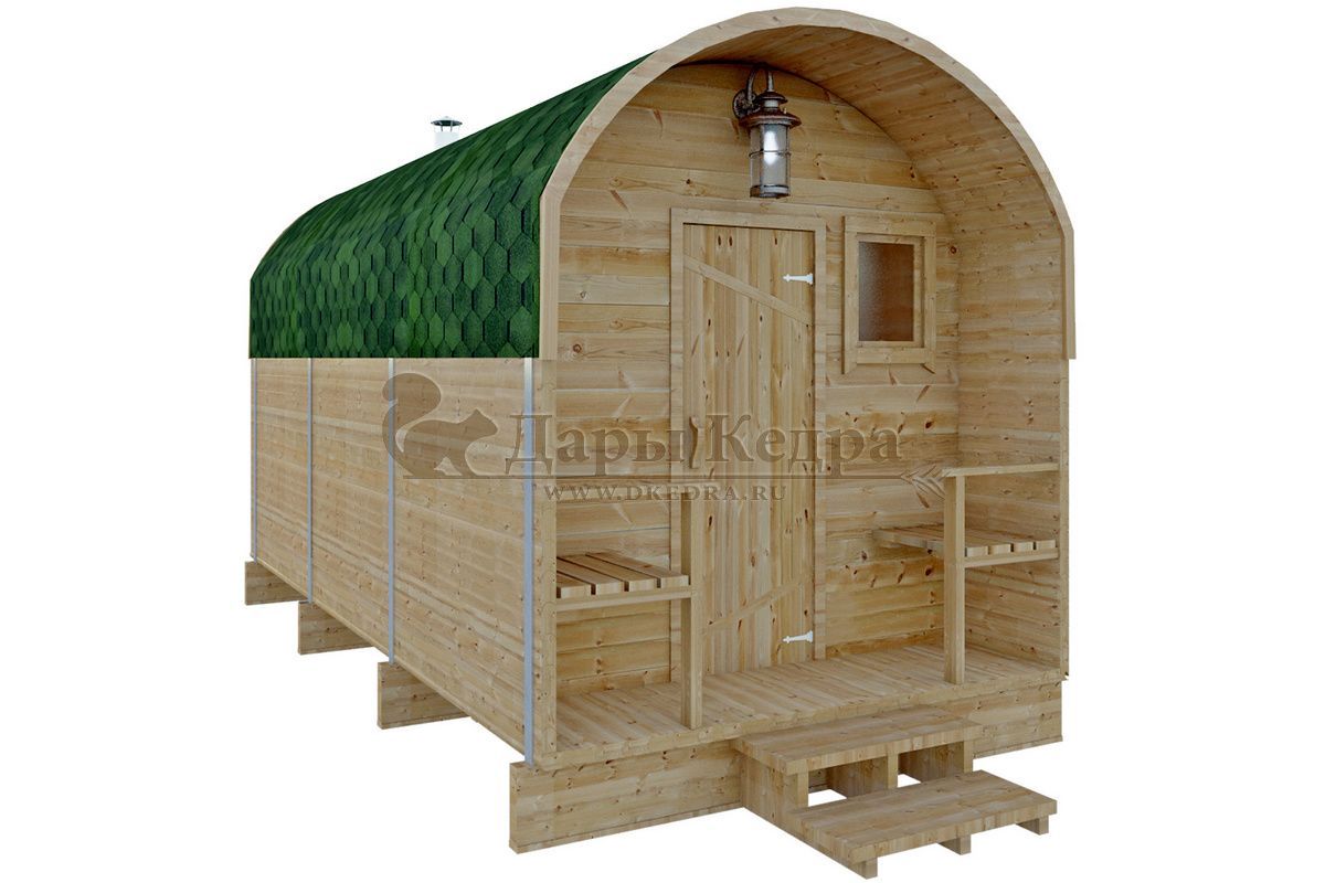 Симбиоз круглой и квадратной бани-бочки. Разработано с учётом эргономики, в ней так же просторно, как и в квадро-бочке, но при этом полукруглая крыша не дает задерживаться снегу и влаге на кровле. А еще такая баня безусловно красивая, мобильная и доступная каждому!