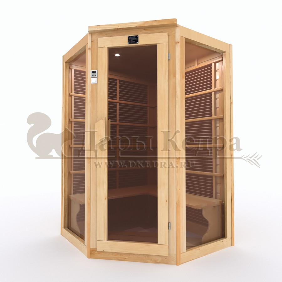 Двухместная угловая инфракрасная сауна кабина из кедра с керамическими излучателями Это специально оборудованная кедровая кабина для прогрева тела человека сухим теплом. Воздух в таких парных не нагревается. Инфракрасные лучи воздействуют на тело, равномерно прогревая мышцы, суставы и органы. Керамические излучатели похожи на лампы, имеют высокую температуру нагрева, поэтому защищены противоожоговыми решетками. Тело человека в таких саунах нагревается интенсивнее. Работает кабина за счет электричества. Установка сауны в угол, позволяет рационально использовать пространство помещения. Подходит как для домашнего использования, так и для коммерции. Обращаем Ваше внимание что в стандартную комплектацию входит трапик для ног, но вы можете его заменить на цельный пол совершенно бесплатно! Целебная древесина кедра и инфракрасные лучи благотворно влияют на организм человека в целом. При регулярном использовании инфракрасной сауны укрепляется иммунитет, улучшается кровообращение и состояние кожи, выводятся токсины.