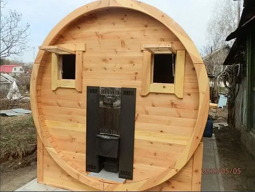 Баня бочка стоит уже полтора года, топка с наружи, нам такой вариант больше понравился, т.к. мусор от дров остается на улице. Всего 40 минут надо, чтоб в бане стало жарко. Паримся зимой и летом! Рекомендую.
