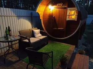 Много читал про такие бани-бочки, долго анализировал, в итоге пришел к мнению, что трехметровая баня-бочка-это оптимальное соотношение цены и качества, пространства. Кстати, в ней вполне хватает места даже для одновременного нахождения 3-4 человек, комфортнее, конечно, вдвоем)). Смотрится на участке красиво! Несколько раз протестировали баньку, остались очень довольными, а впереди целое лето...будем париться почти каждый день))